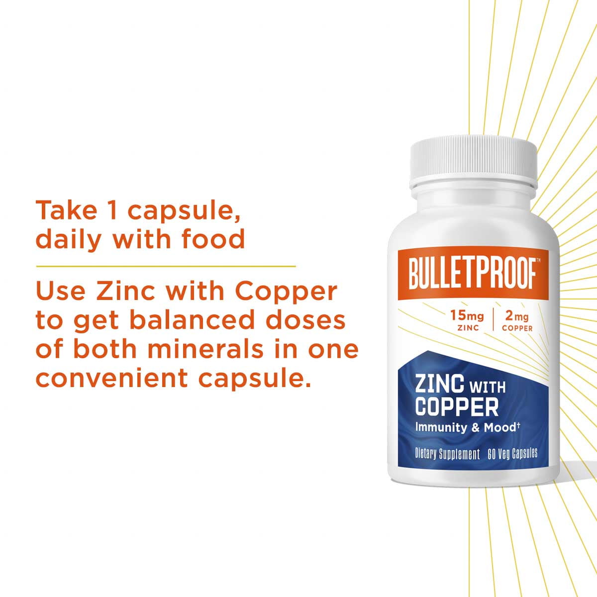 Bulletproof Zinc with Copper Capsules, 60 Count, Minerals and ... This zinc supplement with copper provides balanced doses of both essential minerals in one convenient capsule ; Zinc is a key player throughout your body, from immunity to mood. Copper is vital for functions like making energy and blood cells ; Naturally sugar-free, gluten-free, non-GMO, soy-free, no added dyes and lab-tested for purity and potency ; At Bulletproof, we only …