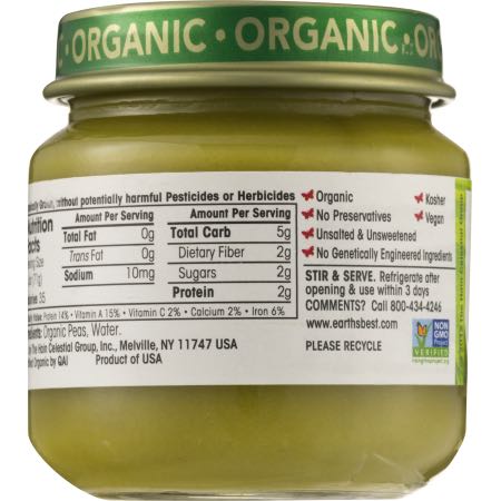Earth's Best Organic Stage 1 Baby Food, First Peas, 2.5 oz. Jar Earth's Best Organic Stage 1 Baby Food, Fruit Jars Variety Pack, 4 oz (Pack of 12) 273 1 offer from $20.99 Climate Pledge Friendly Earth's Best Organic Stage 2 Baby Food, Protein Jars Variety Pack, 4 oz (Pack of 12) 354 1 offer from $15.98 Climate Pledge Friendly